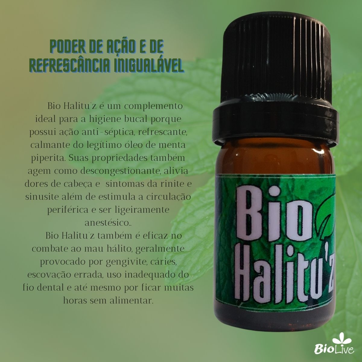 Composto de óleos essenciais de menta piperita e Balsam Copaíba, BioHalitu’z é um complemento ideal para a higiene bucal. Possui ação anti-séptica, refrescante, calmante, descongestionante, alivia os sintomas da rinite e sinusite, estimula a circulação periférica, é ligeiramente anestésico além de promover alívio de gases estomacais e dores de cabeça sendo super eficiente no combate ao mau hálito, geralmente provocado por gengivite, cáries, escovação errada e uso inadequado do fio dental.